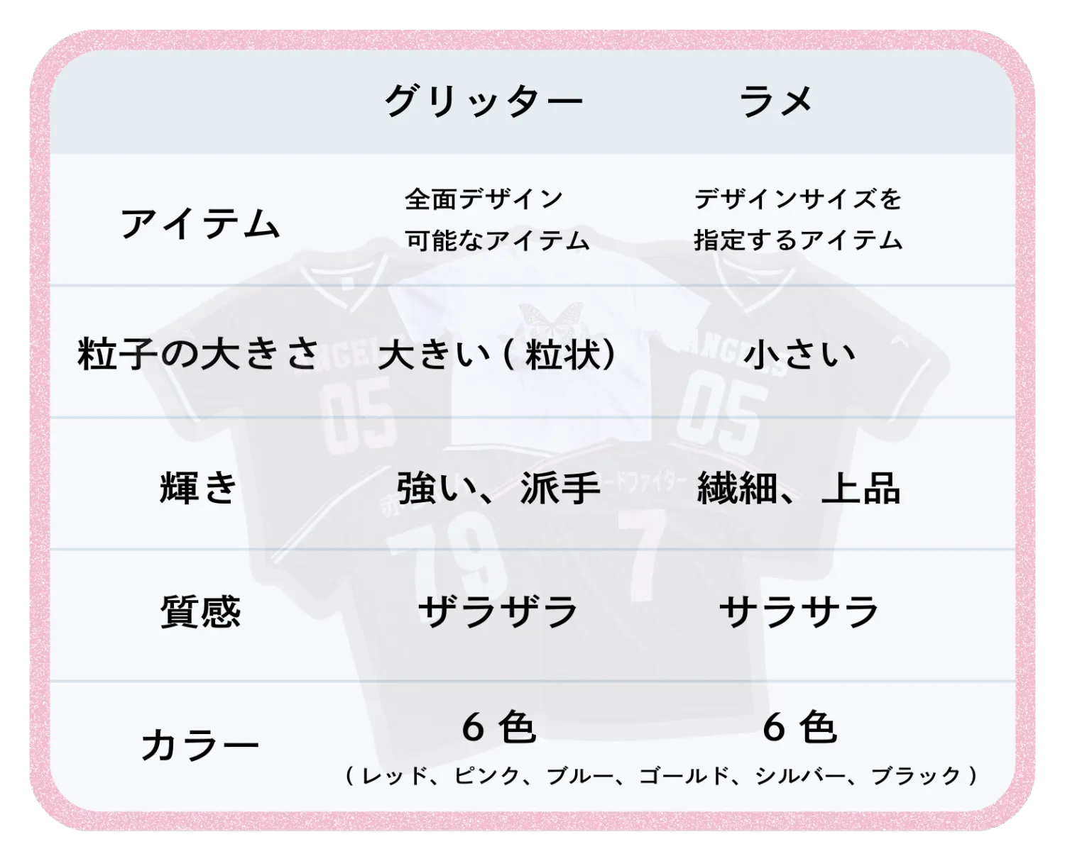 背番号や背ネーム、Tシャツにプリントするデザインをグリッター・ラメプリントで作成したい!というお客様からの お問い合わせをたくさんいただいております♡